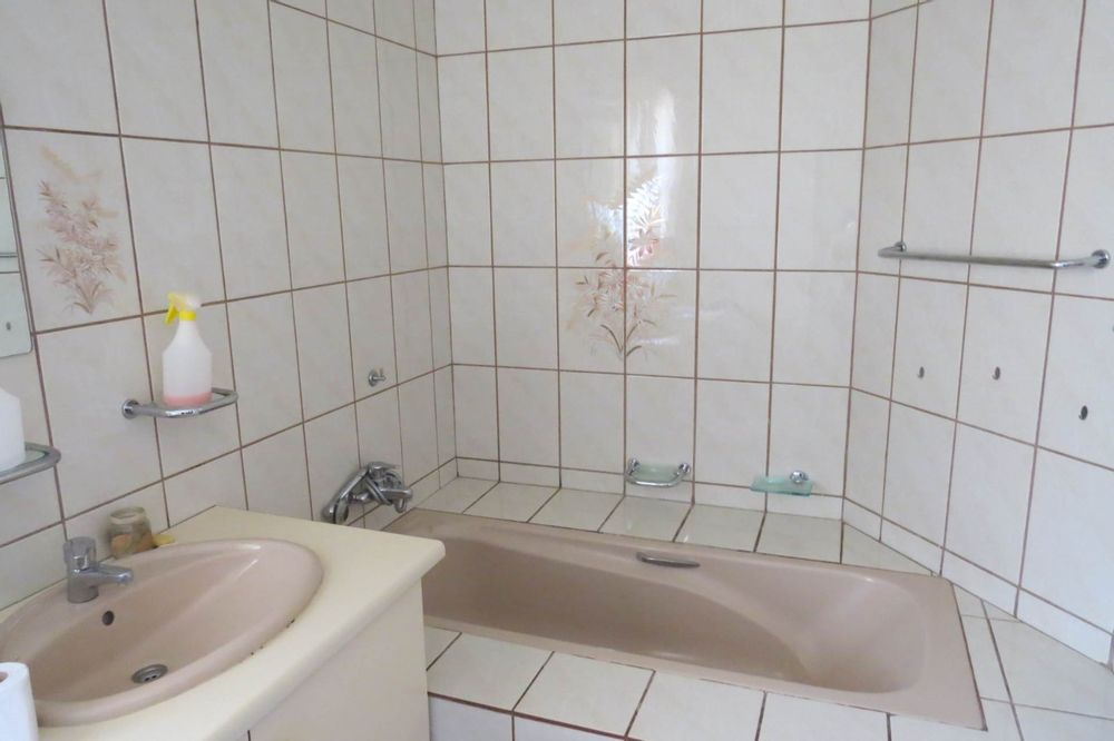 3 very large bedrooms and 2 bathrooms. The main bathroom has a gigantic shower big enough to fit in the whole family! It is a double storey house with its own entrance. There is a great laundry area and a pantry. It has a very modern kitchen, remodelled to perfection with updated features! This property includes a very tasteful and classy bar, lounge, dining room and a living room area as well as underground wine cellar and indoor braai area! Lovely house for entertaining! There is also a laundry, pantry and a double shade net for parking. Large birdcage on premises too. The large sparkling swimming pool with an outside shower is perfect for hot summer days!